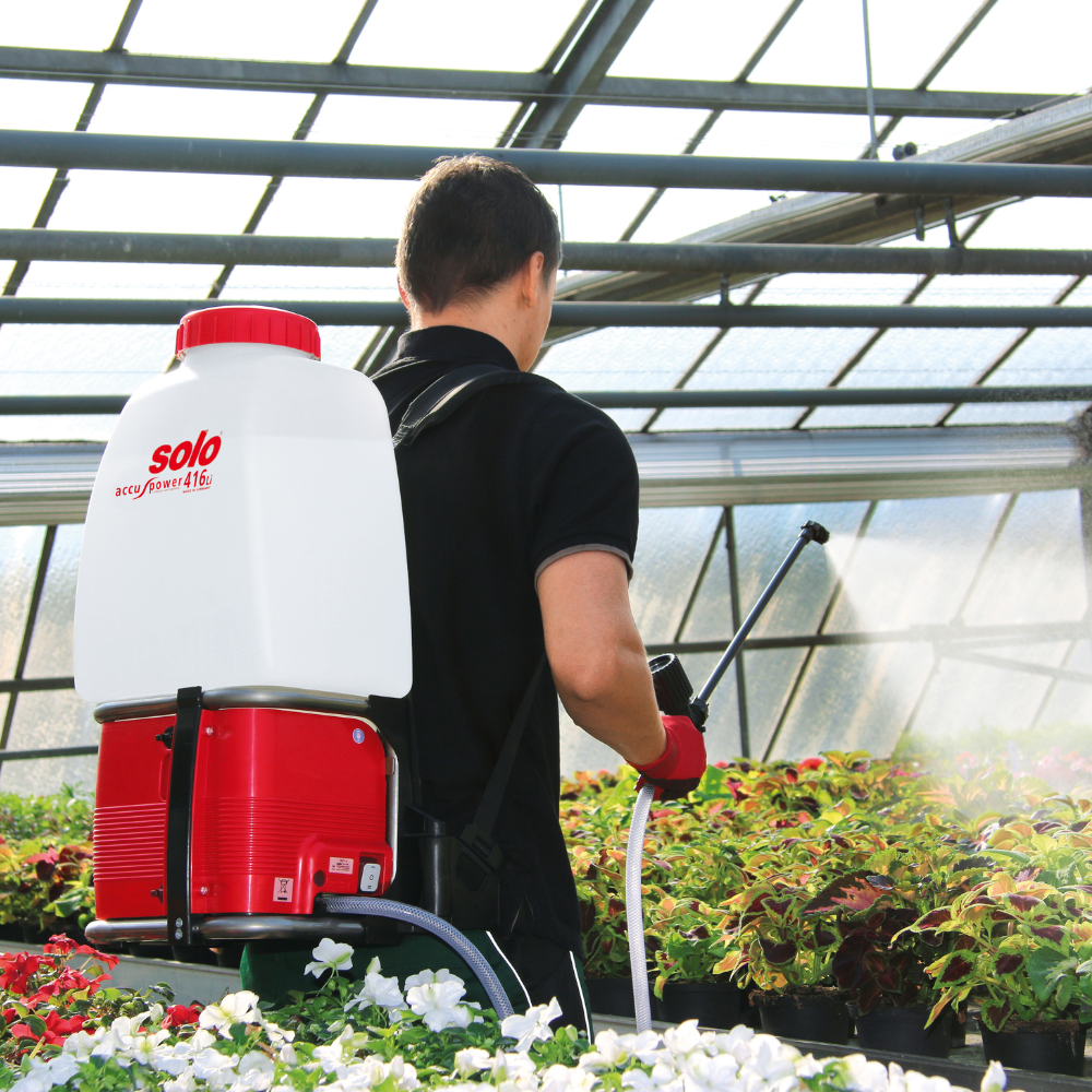 En los espacios cerrados como invernaderos no hay que renunciar a trabajar de forma eficaz y a gran rendimiento. Para estos campos de aplicación especiales SOLO ofrece el pulverizador a batería de mochila 416 Li. Con un depósito grande 20L resistente a los rayos ultravioletas. La bomba fuerte de 12V ofrece dos niveles presión con hasta 4,3 bares. Se encargan de que se genere la presión y el rendimiento necesario. Su bajo peso en vacío garantiza que se pueda trabajar sin cansarse. Si la batería se vacía, el cargador suministrado se vuelve a cargar de nuevo en solo unas pocas horas. El SOLO 416 Li dispone también de un bastidor cómodo y correas cómodas para los hombros, ambos acolchonados.
