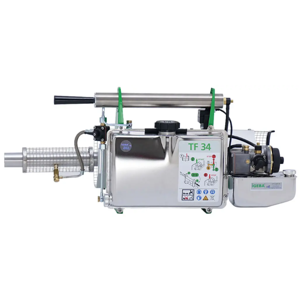 Una longitud total de sólo 78 cm y un peso en vacío de 6,6 kg hacen del TF 34 el nebulizador térmico más pequeño y ligero de la marca IGEBA. Durante el desarrollo, el objetivo principal fue la niebla en habitaciones cerradas. Se caracteriza por su diseño compacto, su bajo peso y sus excelentes valores de emisión. Por supuesto, también puede utilizarse en el exterior.